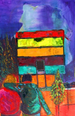 Two figures embrace in a surreal landscape. A tree house sits high on stilts taking up residence at the centre of the painting it has no door but the ladder has no steps.